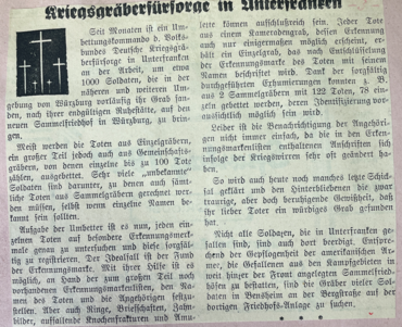 Mit einem Gedenkkonzert am Vorabend in der Residenz und einer feierlichen Zeremonie auf dem Hauptfriedhof übergibt der Volksbund Deutsche Kriegsgräberfürsorge am 8. und 9. Mai 1954 die neu gestaltete Kriegsgräberstätte in die Obhut der Stadt Würzburg. Die Übergabe jährt sich am diesjährigen Himmelfahrtstag, zugleich auch Europatag, zum 70. Mal.