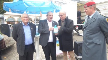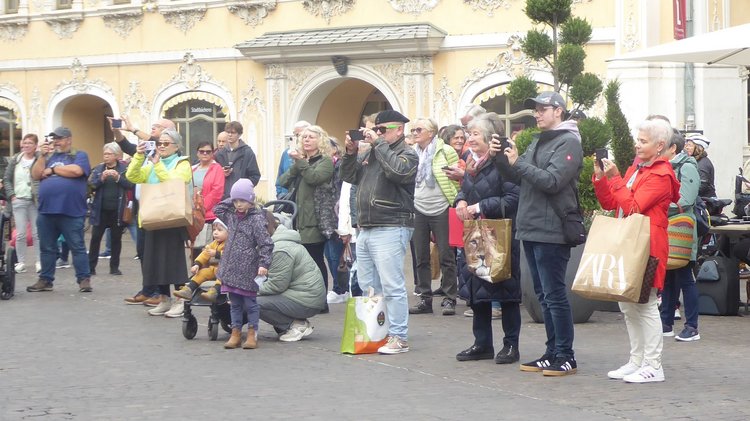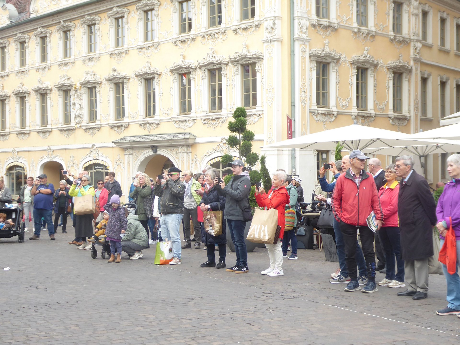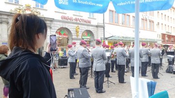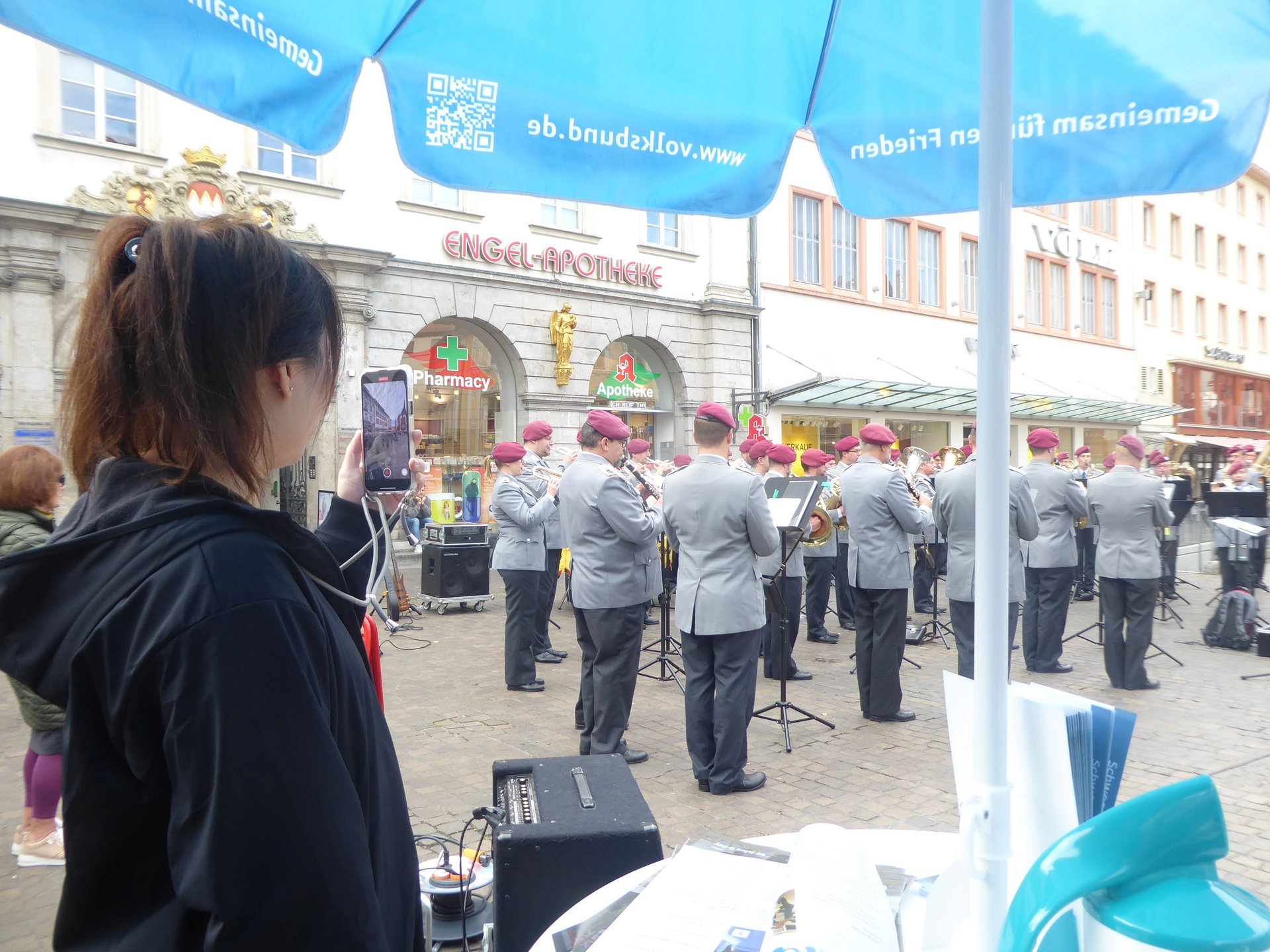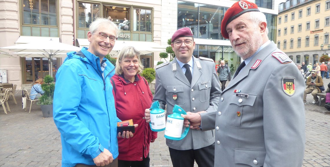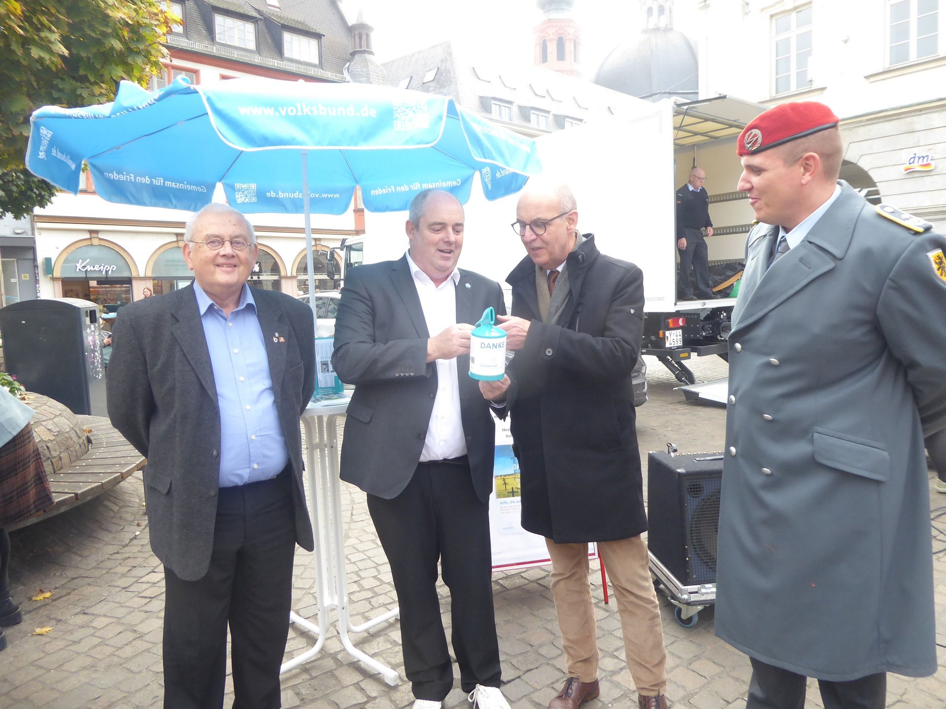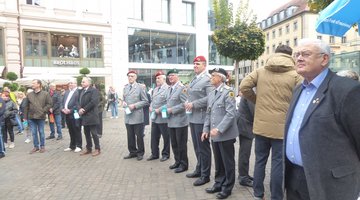 Schwungvoll startete in Unterfranken der Volksbund Deutsche Kriegsgräberfürsorge in die herbstliche Haus-, Straßen- und Friedhofssammlung: Das Heeresmusikkorps Veitshöchheim unter der Leitung seines neuen Kommandeurs Hauptmann Wolfgang Dietrich unterstützte wieder die Auftaktsammlung mit einem Standkonzert auf dem Oberen Markt in Würzburg. Angeführt von Regierungsvizepräsident Joachim Lange sammelten Vertreter aus Politik, Bundeswehr, Kirche, Polizei und Ehrenamt für die Kriegsgräberfürsorge. Regierungsvizepräsident Joachim Lange und Volksbund-Bezirksgeschäftsführer Oliver Bauer freuten sich gleichermaßen über den großen Zuspruch sowohl bei den Sammlungsteilnehmern, u.a. MdB Paul Lehrieder und MdL Björn Jungbauer sowie Landrat Thomas Eberth und die 3. Bürgermeisterin der Stadt Würzburg Judith Roth-Jörg, als auch bei den Zuhörern. Zahlreiche Passanten verweilten mehr als nur ein paar Takte, um der abwechslungsvollen Darbietung des Heeresmusikkorps zu lauschen. Bei Klängen vom Radetzky-Marsch bis zum Pop-Song “No roots” spendeten viele Zuhörer ein paar Euro und einen Fünf-Dollar-Schein in die Sammelbüchsen des Volksbundes.