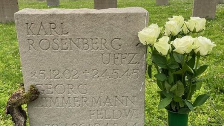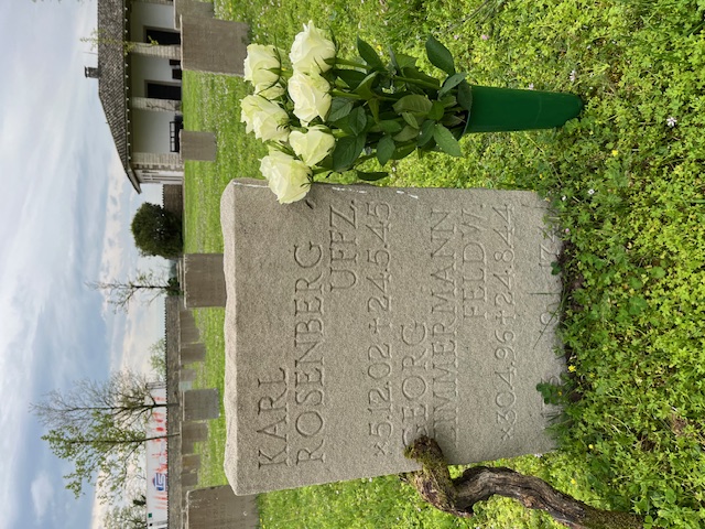 Jetzt machten wir uns auf den Weg zu Block 10, wo er mit drei weiteren gefallenen Kameraden beigesetzt worden ist. Je näher wir dem Grabstein kamen, desto aufgeregter waren wir. Als meine Frau Anne den Namen ihres Großvaters entdeckte war die Freude sehr groß. Der langjährige Traum ging jetzt in Erfüllung. Wir waren beide überglücklich und legten eine Weinrebe aus unserem Weinberg aus Franken an den Grabstein. Außerdem stellten wir einen Bund weiße Rosen an das Grab. Mit einem gemeinsamen Gebet gedachten wir unserem Familienmitglied und fühlten die Verbindung jetzt mit ihm, obwohl wir uns nicht gekannt haben. Zur gleichen Zeit flog ein Flugzeug vom benachbarten Flugplatz von Lyon über den Friedhof. Auch hoppelte ein Hase neben den Kreuzen vorbei, interessanterweise werden die „Sommerhäuser“ als Hasen bezeichnet.