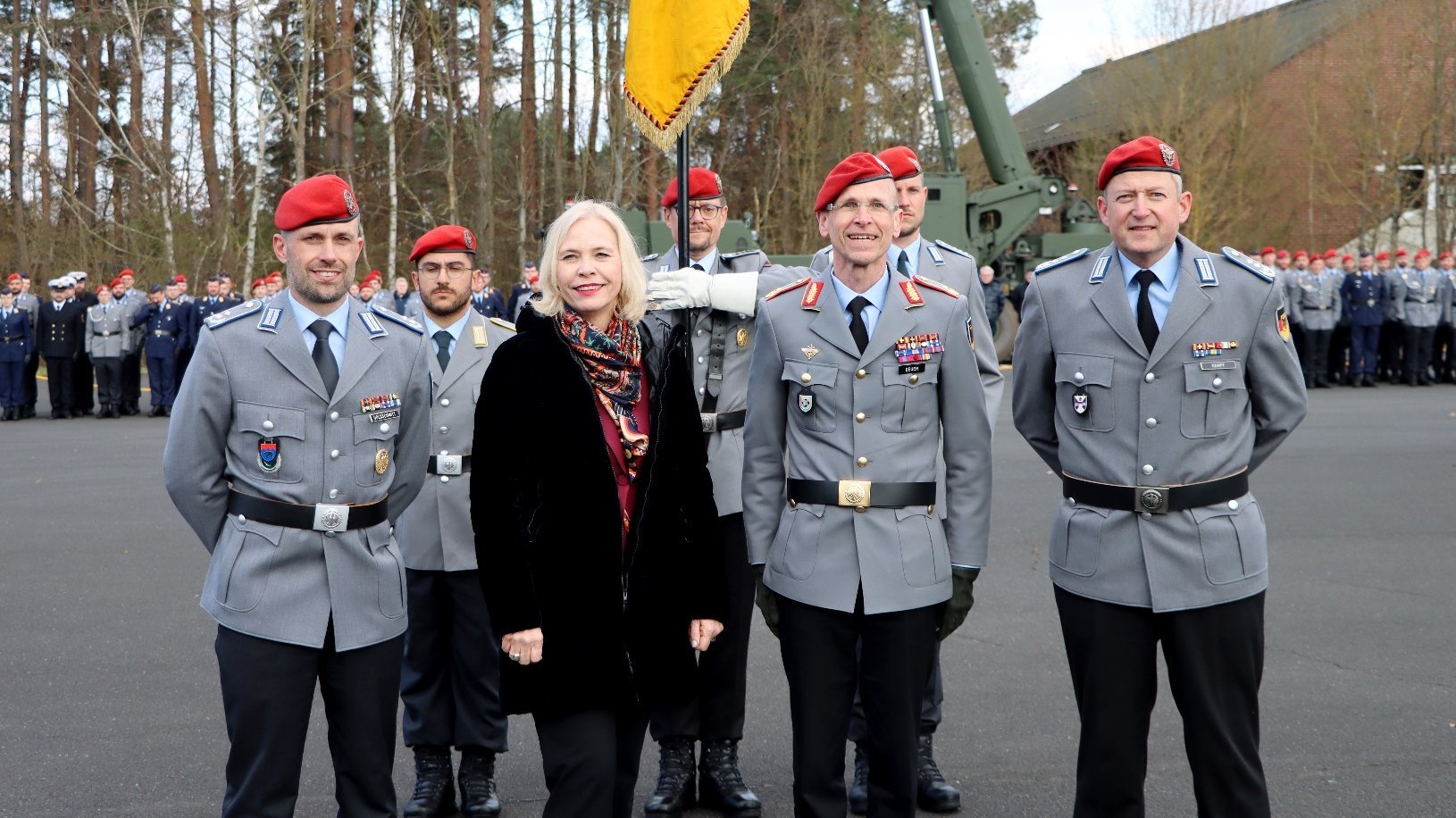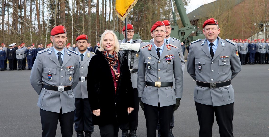 Die Festansprache anlässlich der Insdienststellung des schweren Logistikbataillons hielt Regierungspräsidentin Dr. Susanne Weizendörfer. Die Regierungspräsidentin, die auch Bezirksvorsitzende des Volksbundes in Unterfranken ist, verlieh dem Bataillon gemeinsam mit Generalmajor Jochen Deuer und Regimentskommandeur Oberst Matthias Kampf das Fahnenband mit dem Beinamen “Mainfranken”. Seit dem Jahr 2000 führte die inzwischen aufgelöste Panzerbrigade 36 den traditionsstiftenden Namen. Nun lebt der Name in Volkach neu auf. Das heutige schwere Logistikbataillon steht dabei in direkter Nachfolge zu einem der ersten Verbände der Panzerbrigade 36, dem Versorgungsbataillon 366 in Bad Mergentheim.
